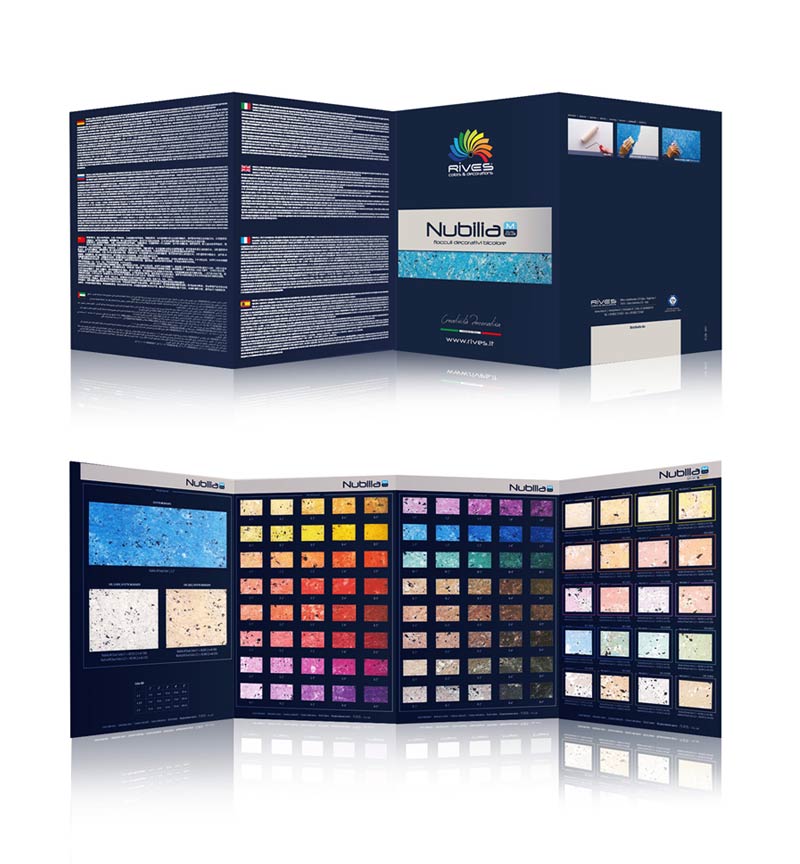 NUBILIA M LUX COLOR is a water-based paint for interiors, with a base of decorative flakes able to reproduce several different chromatic effects. Easy to apply, it confers to the surfaces a harmonious natural and iridescent play of colours.To obtain all the colours on this chart, it is necessary to utilise, in combination with each other, the following products: coloured PRELUDIO with the COLOR KIT (or alternatively, the SISTEMA TINTOMETRICO RIVES); NUBILIA M LUX COLOR additive with METAL KIT available in the shades of IRIDE BLU 426, IRIDE VERDE 427, IRIDE ORO 428, IRIDE ROSSO 429, IRIDE VIOLA 434 and IRIDE ARANCIO 438.
