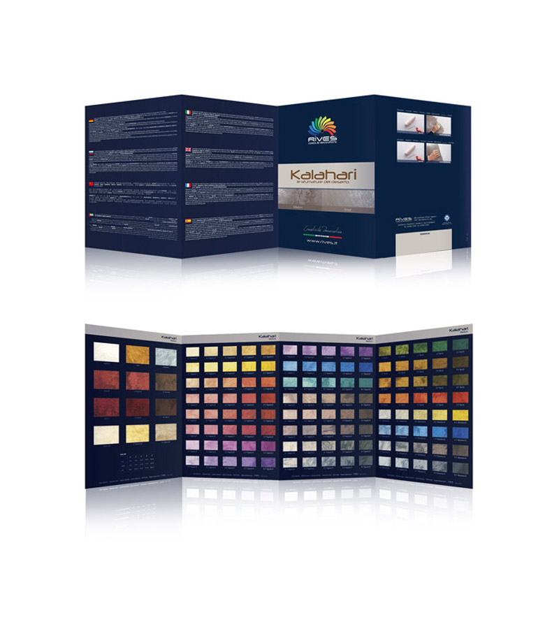 KALAHARI MEDIUM/SMALL is available in metallic bases ARGENTO 01 - ORO 02 - ALLUMINIO 03 - BRONZO 04 - RAME 05 - IRIDE ORO 428. The available colours are obtained by mixing one of the KALAHARI MEDIUM/SMALL metallic base with the indicated dose of dye paste called COLOR KIT or alternatively with the RIVES Tinting System. Preparation of the medium: mediums must be thoroughly dry. Clean the surfaces to be treated by removing any loose or flaking material. Apply, at a time interval of 5-6 hours from one anoDOWNLOAD COLOR CHART
